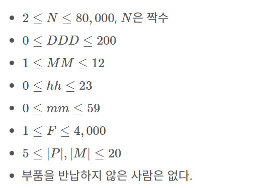 두 번째 줄부터 N+1번째 줄까지 시간순으로 부품 대여장에 작성한 정보 (시각, 부품 이름 P, 회원 닉네임 M)이 공백으로 구분되어 주어진다.