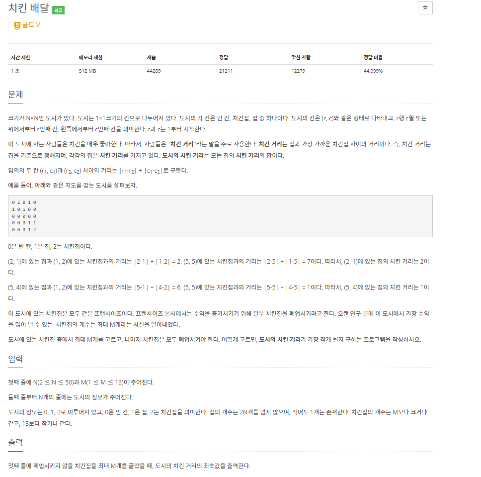 //한 집으로부터 최소 치킨 거리가 현재까지 구한 최소 치킨 거리보다 클 경우 유망하지 않기 때문에 가지치기(백트래킹)