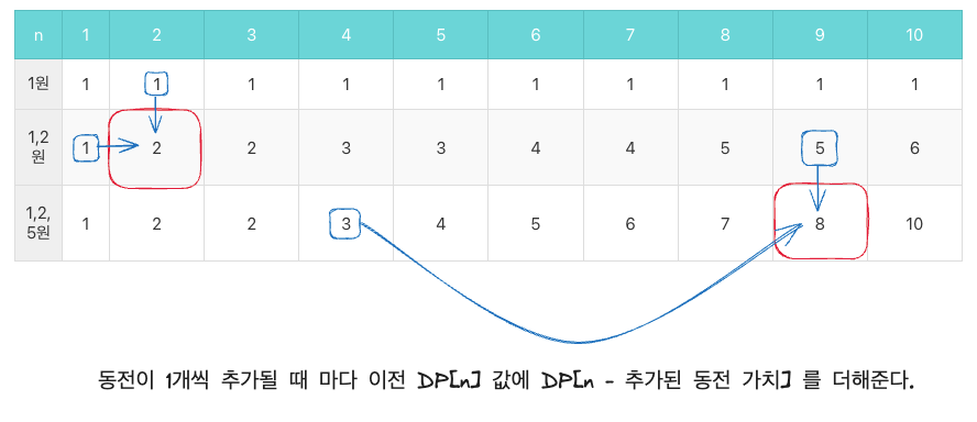 dp[n] += dp[n - coins[i]] 가 점화식으로 도출되는 것 이다.