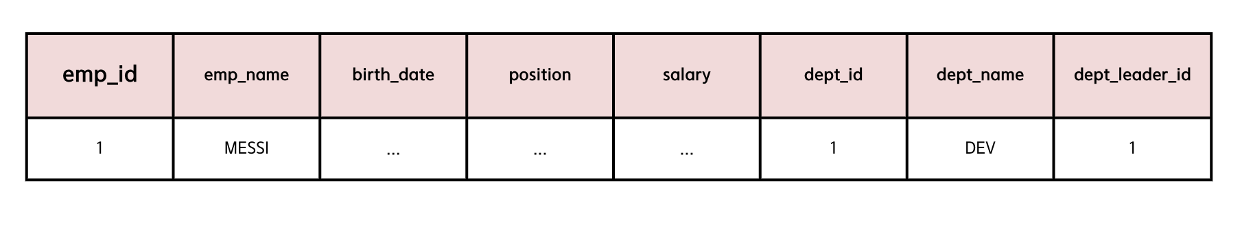 여기서 문제는 부서 정보입니다. 해당 부분을 보면 동일한 데이터가 중복으로 들어가 있습니다. 지금은 두 건 뿐이지만 데이터가 많아질경우 저장공간을 낭비한다는 단점이 있습니다.