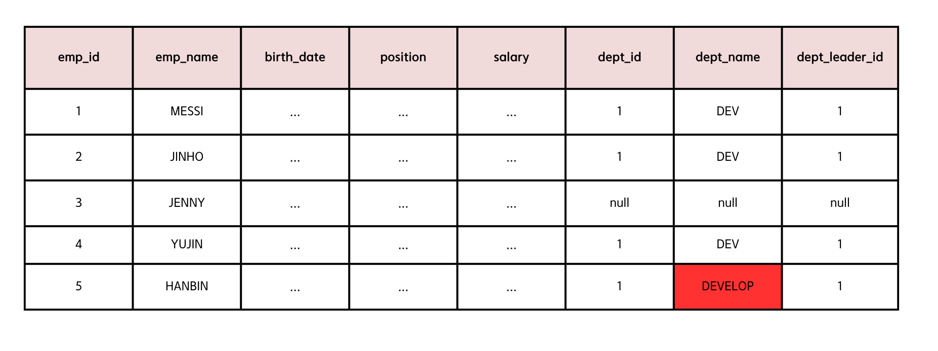 해당 테이블은 사원 정보와 부서 정보를 함께 담고 있는 테이블 (이하 A) 입니다.
